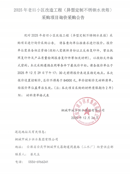 2025年迈旧小区刷新工程(异型定制不锈钢水表箱)采购项目询价采购通告