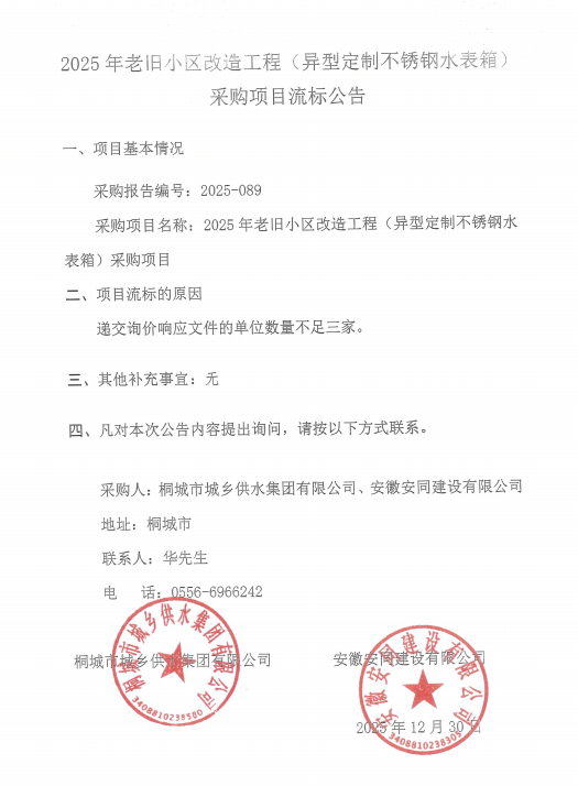 2025年迈旧小区刷新工程(异型定制不锈钢水表箱)采购项目流标通告