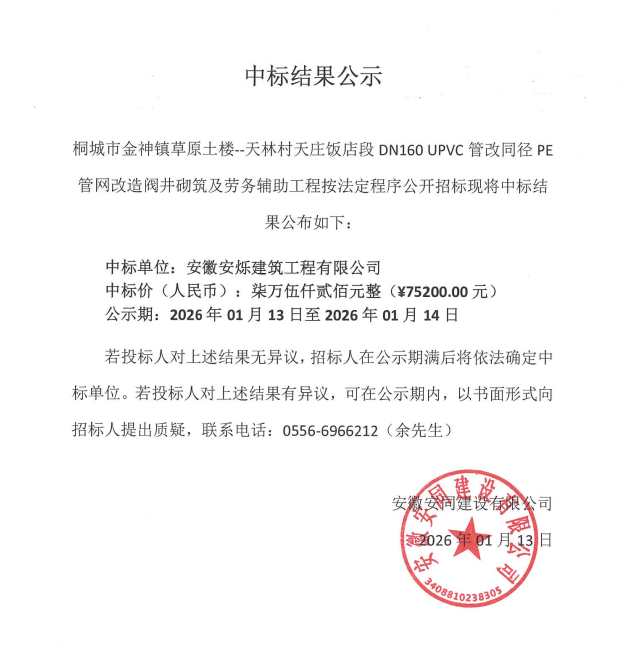 桐都会金神镇草原土楼--天林村天庄饭店段DN160 UPVC管改同径PE管网刷新阀井砌筑及劳务辅助工程 中标效果公示