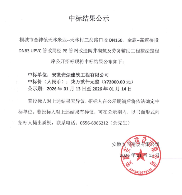桐都会金神镇天林米业--天林村三岔路口段DN160、金鹿--高速桥段DN63 UPVC管改同径PE管网刷新阀井砌筑及劳务辅助工程 中标效果公示