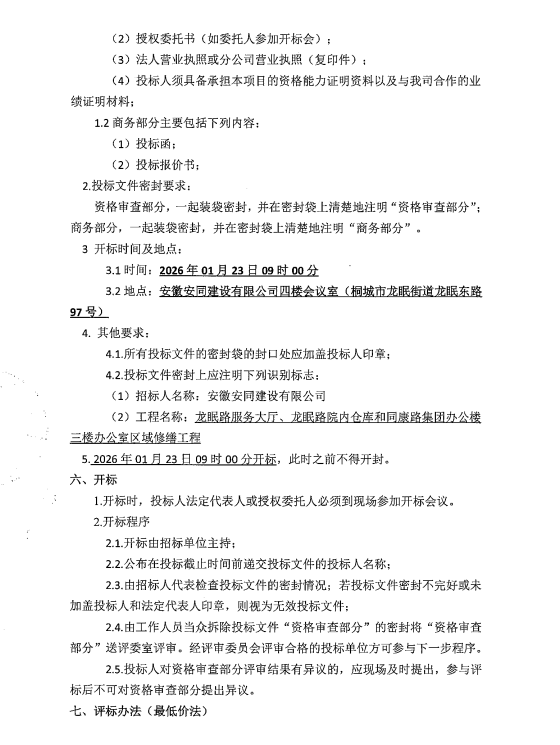 龙眠路效劳大厅、龙眠路院内客栈和同康路集团办公楼三楼办公室区域修缮工程招标通告