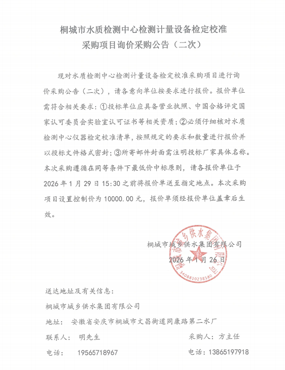 桐都会水质检测中心检测计量装备检定校准采购项目询价采购通告(二次)