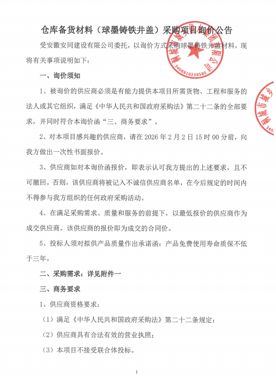 客栈备货质料(球墨铸铁井盖)采购项目询价通告