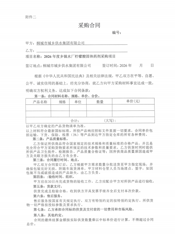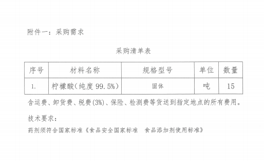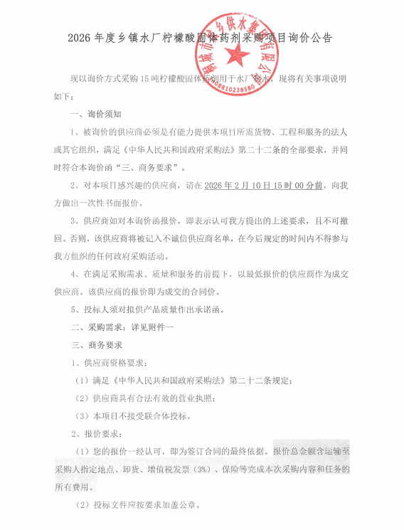 2026年度州里水厂柠檬酸固体药剂采购项目询价通告