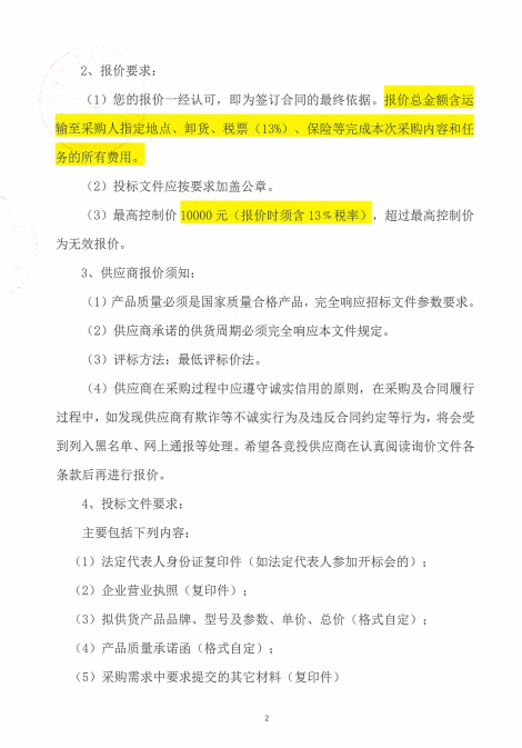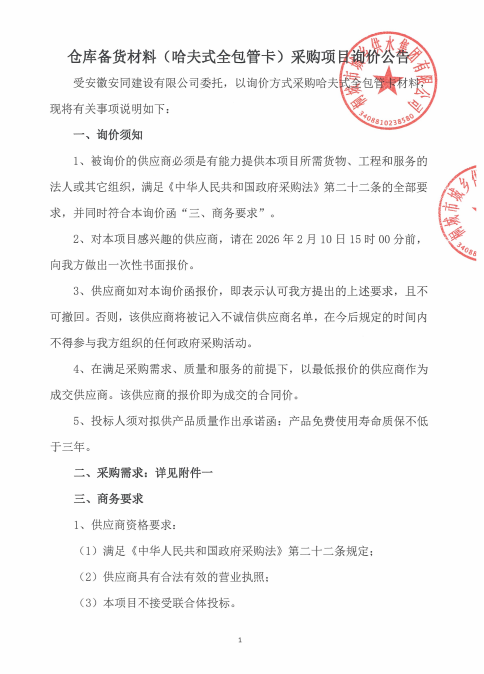 客栈备货质料(哈夫式全包管卡)采购项目询价通告