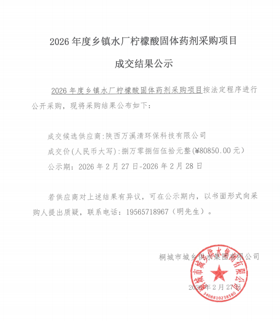 2026年度州里水厂柠檬酸固体药剂采购项目成交效果公示