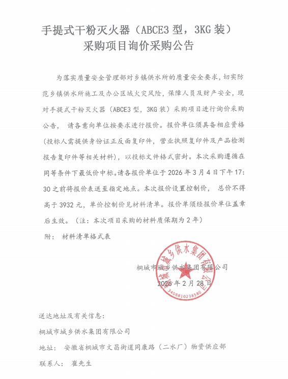 手提式干粉灭火器(ABCE3型, ,, ,,,,3KG装)采购项目询价采购通告