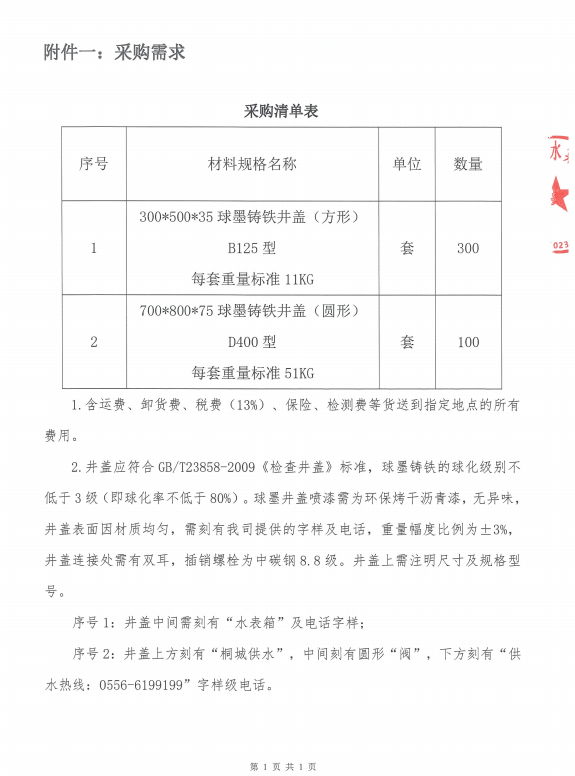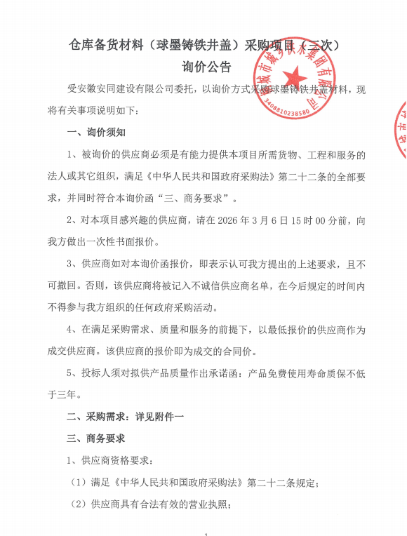 客栈备货质料(球墨铸铁井盖)采购项目(三次)询价通告