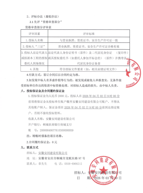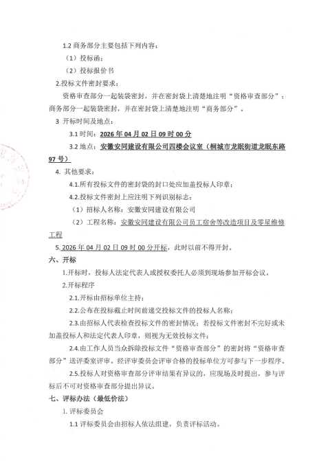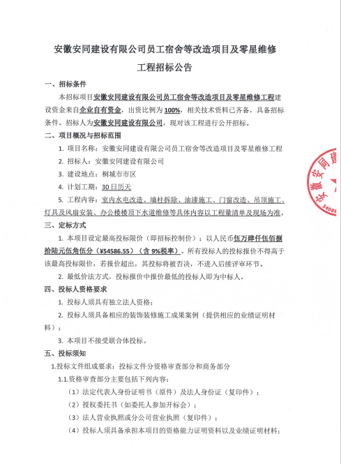 安徽安同建设有限公司员工宿舍等刷新项目及零星维修工程招标通告